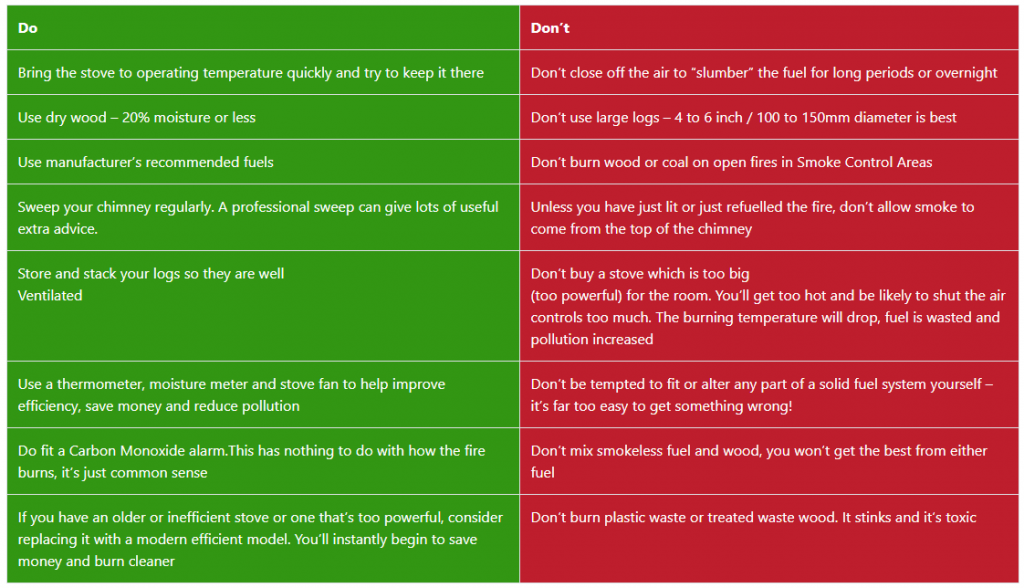 • Smokeless fuel;   sweep once every year when you stop using your fire for the Summer. Avoid if not in Smoke controlled area. This will help prolong the life of the stainless steel in the liner or twin walled pipe.